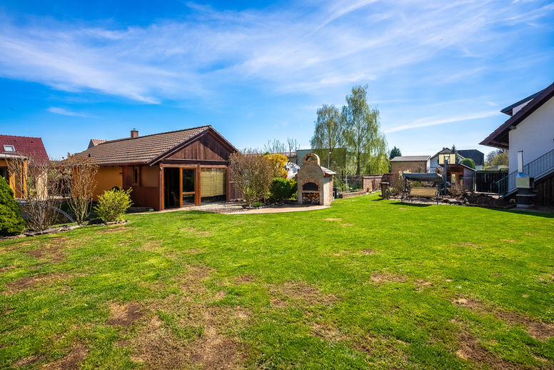 Nemovitost nabízí nadstandardní vybavení, které potěší i náročnější zájemce. Součástí je velká garáž, salonek, venkovní pergola s vlastní toaletou, gril, udírna, venkovní bazén se slanou vodou a zastřešením a elektrická vrata na dálkové ovládání. Před domem a na dvoře je položena zámková dlažba a na pozemku roste vzrostlý živý plot, který zajišťuje dostatek soukromí.